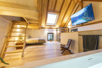 Highlights sind die offene Wohnküche aus einer alten Werkbank, ein modernes Bad, Sauna und Whirlpool-Badewanne, sowie natürliche Baustoffe, außerdem die besondere Atmosphäre des ehemaligen Stallgebäudes.