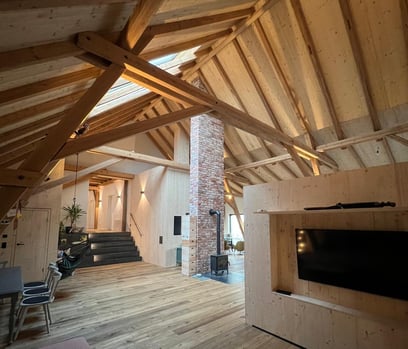 In der ehemaligen Scheune des landwirtschaftlichen Anwesens entstand zwischen 2021 und 2023 die außergewöhnliche Hauptwohnung des Hofes. Der Hauptwohnraum befindet sich in der imposanten Scheunenstruktur mit offenem Sichtbalkenwerk und bis zu 7 Metern Raumhöhe.